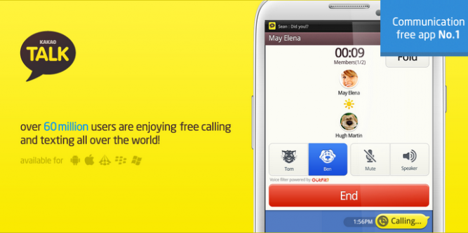 Además con KakaoTalk podrás hacer amigos sin la necesidad de que tengas sus números, sólo un ID es necesario. Esta aplicación también se encuentra disponible en inglés, japonés, chino, indonesio, coreano, tailandes, español, italiano, alemán y más; y no contiene ninguna clase de publicidad.